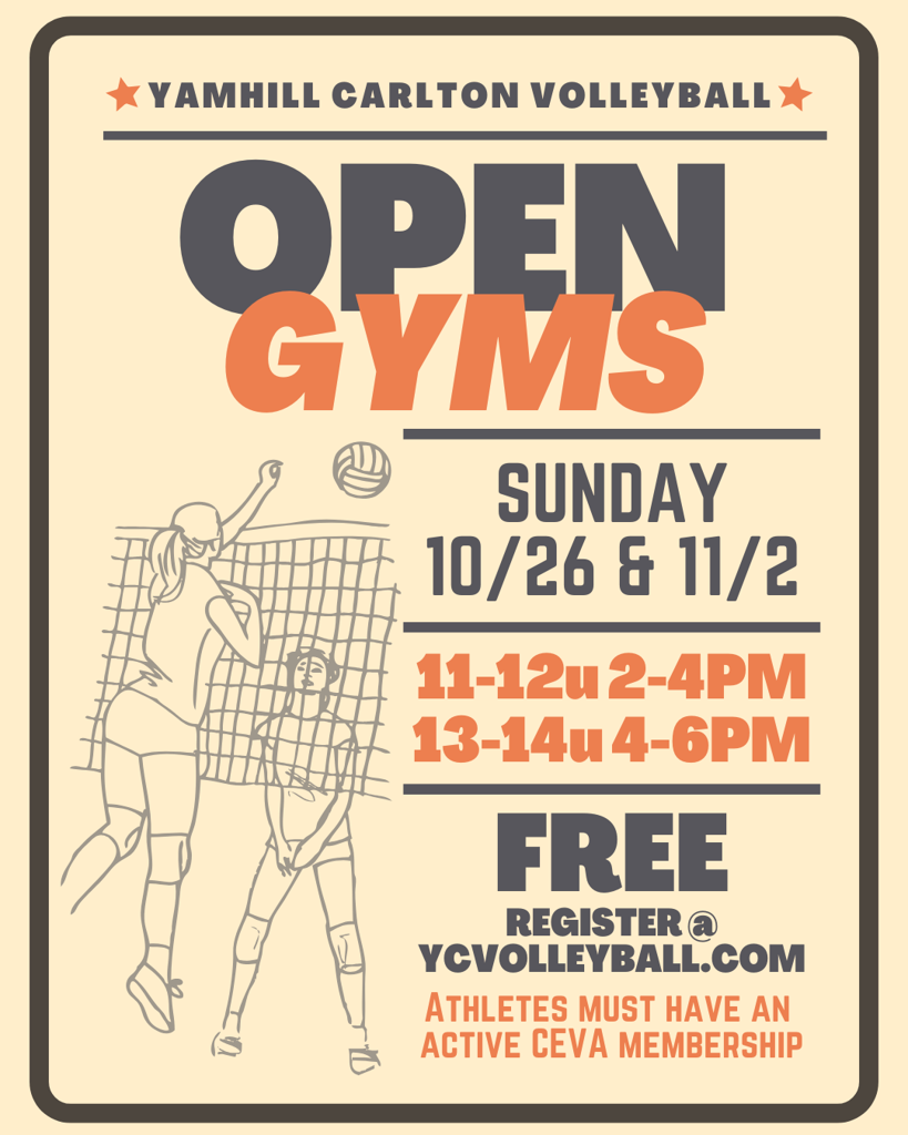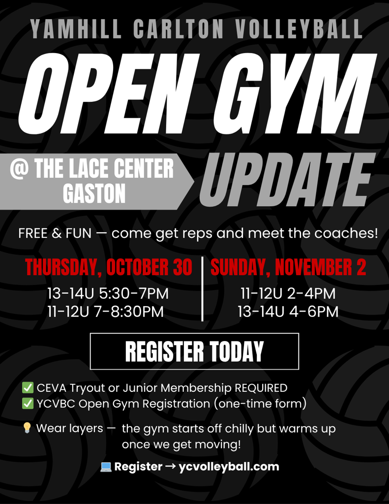 We hold practices across multiple communities — Gaston, Forest Grove, Newberg, Dayton, Yamhill, and Banks — to help keep travel reasonable for families. Once teams are finalized, exact schedules and gym assignments will be announced. Teams typically practice two to three times per week, usually one weeknight and Sundays, depending on gym availability and coaches’ schedules.